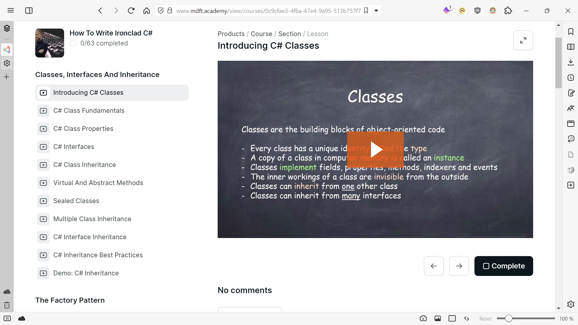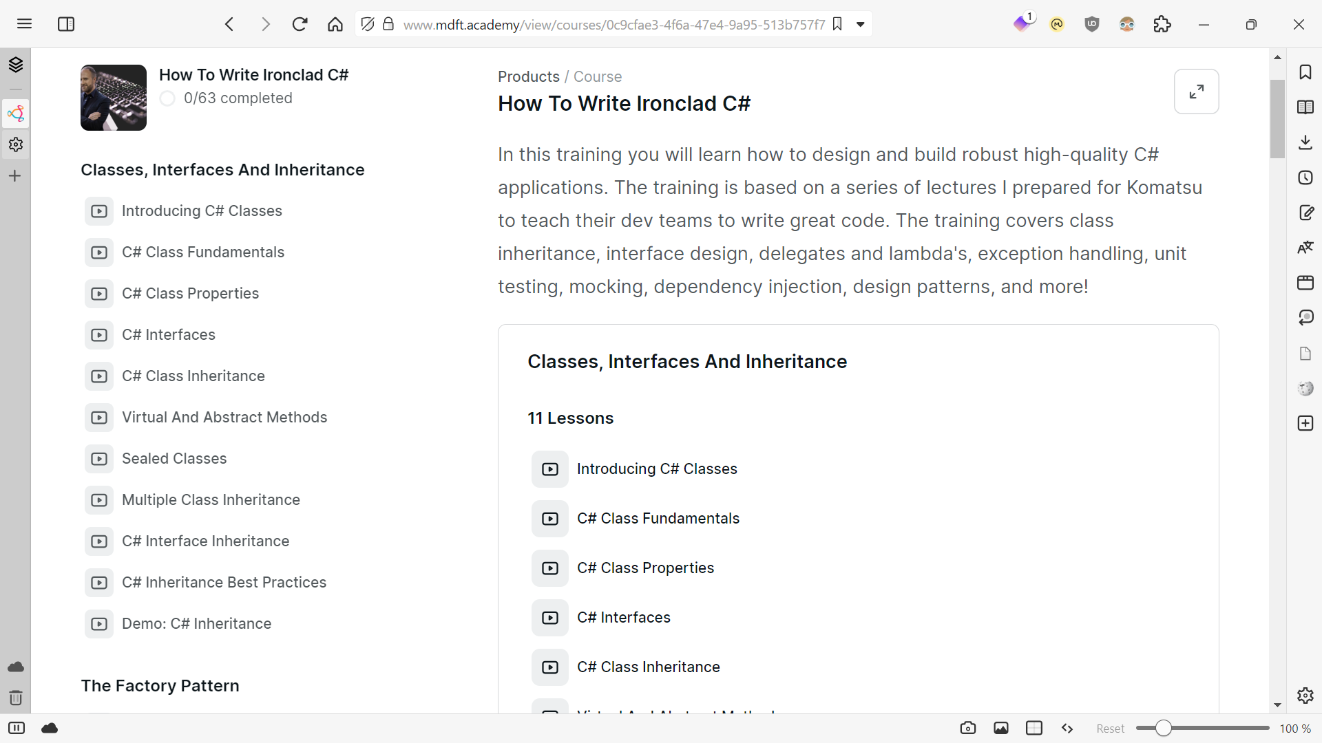 You will learn fundamental C# development topics like class inheritance, interface design, how to use delegates, events and lambda expressions, robust exception handling, unit testing, mocking, dependency injection, threads, tasks, and design patterns.